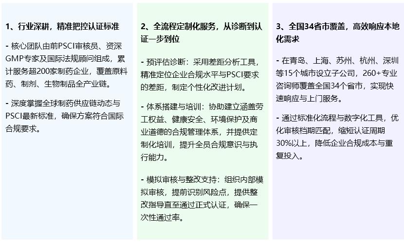 以十多年制药行业合规深耕经验,为企业提供PSCI认证全流程解决方案,助力通过国际认证提升竞争力,构建可持续、合规的全球供应链体系。